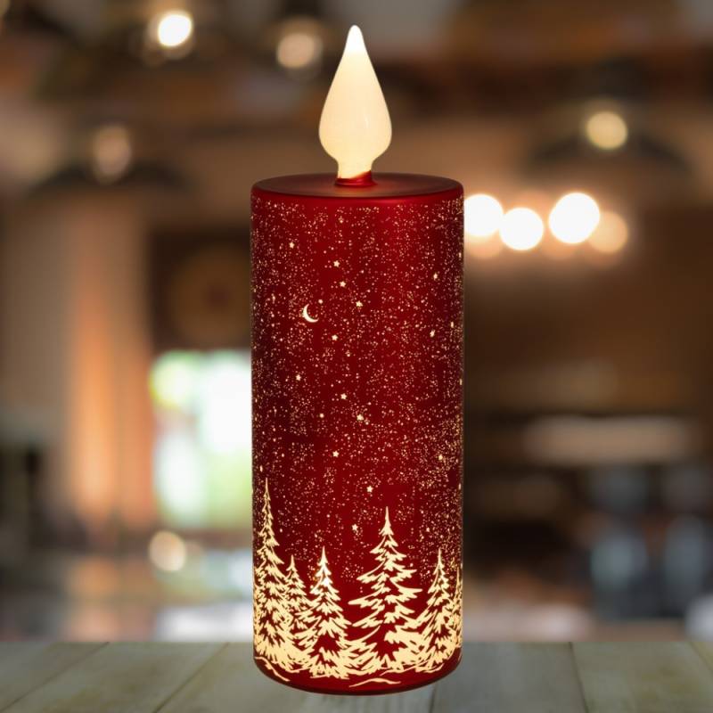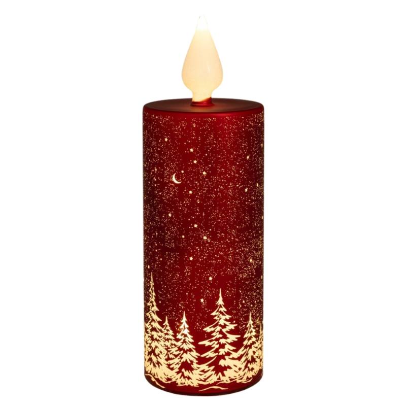 Decoratiune de Craciun luminoasa sub forma de lumanare, cu decor cu brazi inzapeziti. Este iluminata din interior cu leduri cu lumina calda. Poate fi asezata pe masa sau pe raft si poate fi folosita ca lampa de veghe. Functioneaza cu 3 baterii AA (neincluse). Material: sticla, plastic. Diametru: 9 cm. Inaltime: 27 cm. Culori: rosu mat.